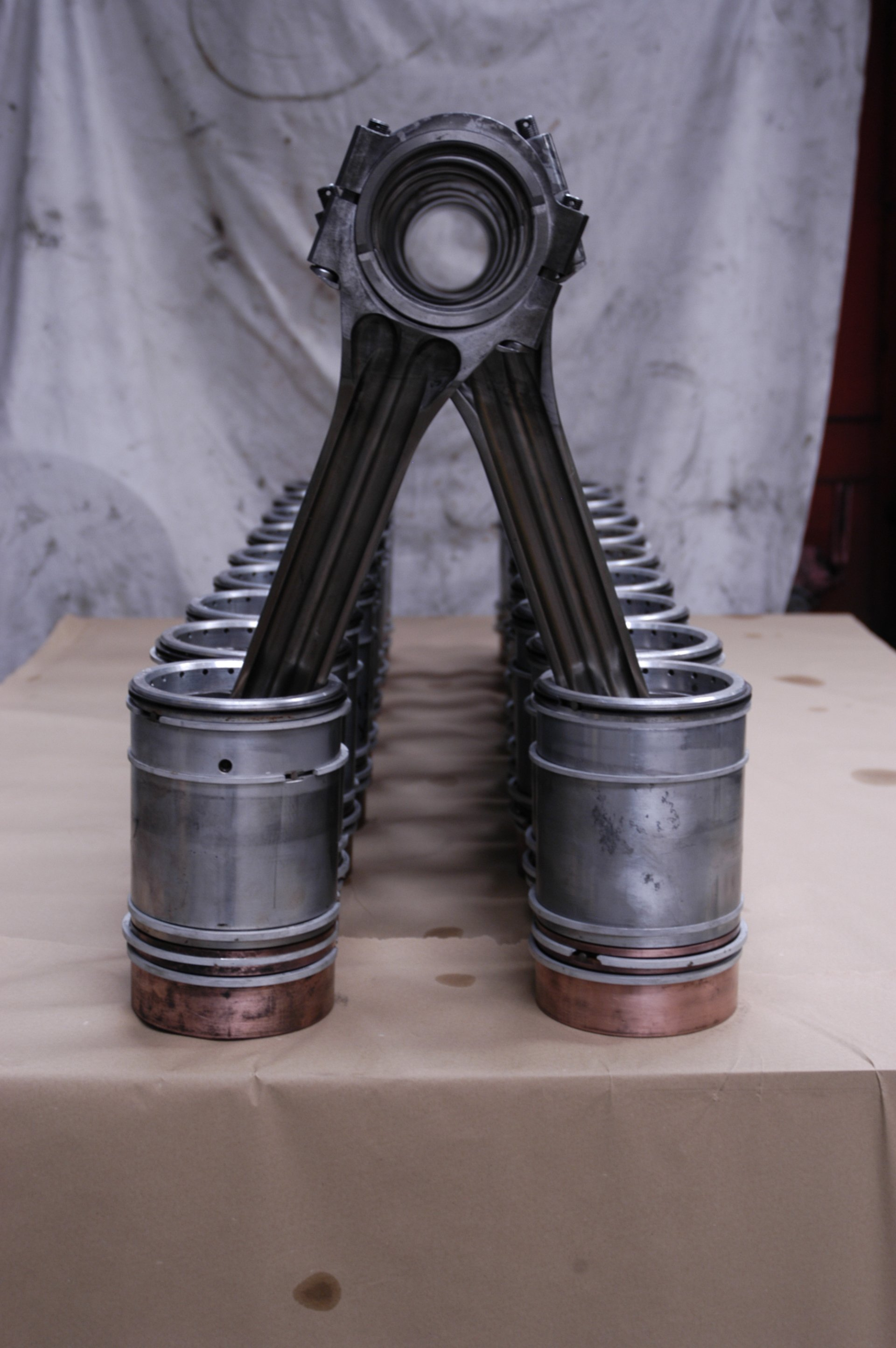 18 pistons from our engine lined up nicely after cleaning, inspectoin and testing. With new rings fitted and Hidural crowns polished ready for installation to the engine.